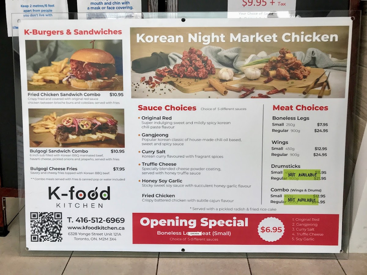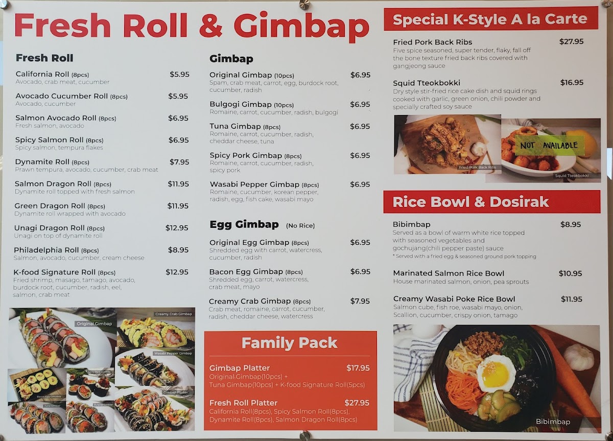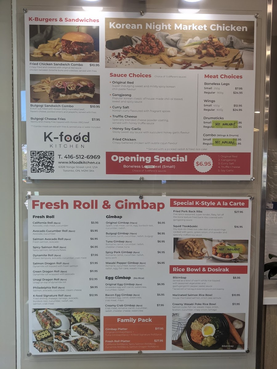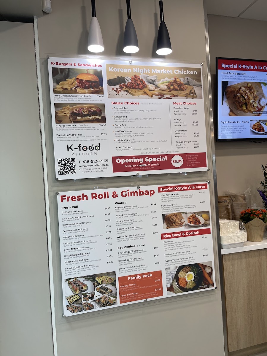 Welcome to MANO MANO (K-food Kitchen), a delightful culinary haven nestled in North York, Ontario. This local gem boasts an extensive menu that captures the essence of Korean cuisine, offering everything from crispy Gangjeong fried chicken to hearty bimbap. Customers rave about the Gimbap, available in generous portions, packed with a variety of delicious fillings. Reviewers consistently mention the perfect balance of flavor and texture, with standouts like the Bulgogi Cheese Fries and the versatile Gimbap & Chicken Combo. One of the unique features is their flexible portion sizing—ideal for those wanting to sample multiple dishes without overspending. Whether you dine in or opt for takeout, the freshness and quality remain unmatched, making it a must-visit for Korean food lovers. With warm service from the owner, Nana, every visit promises to be a memorable one.